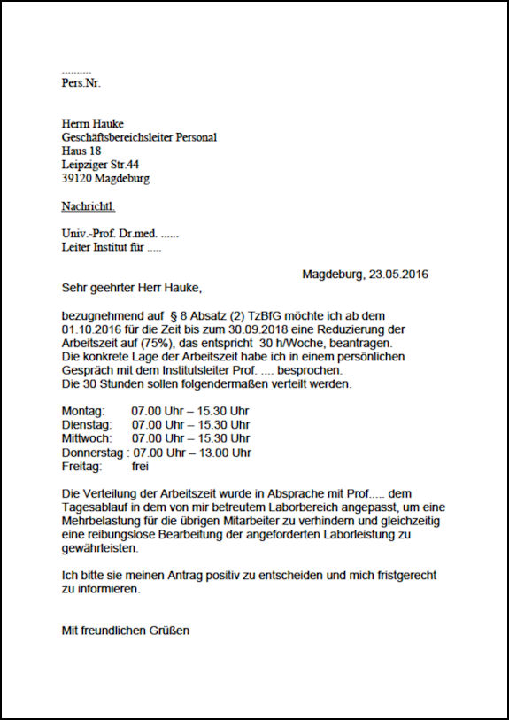 Beispiel für einen aus Arbeitnehmersicht „korrekten Teilzeit-Antrag“